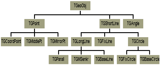 Um den größten Nutzen aus diesem Konzept zu ziehen, muß man also beim Entwurf der Objekttyphierarchie die Objekte so anordnen, dass die Summe der Unterschiede zwischen den abgeleiteten Objekten und ihren jeweiligen Vorfahren minimal wird. Z.B. unterscheiden sich der Objekttyp "TGMiddlePt" im wesentlichen nur in 3 Methoden ("Create", "UpdateParams" und "GetInfo") von seinem Vorfahren "TGPoint", obwohl total verschiedene geometrische Sachverhalte hinter den entsprechenden Objekten stecken. Die hier realisierte Hierarchie ist aber wahrscheinlich nicht optimal, weil ich zu ihrer Entwurfszeit noch keine hinreichenden Erfahrungen mit den projektierten Objekttypen hatte.