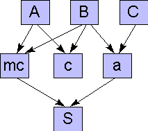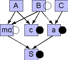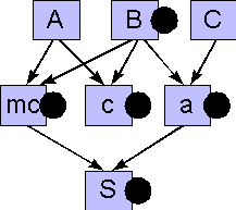 Als nächstes ruft mc seinerseits die Aktualisierungsroutine für S auf. S testet zunächst seine Eltern und stellt fest, dass noch nicht alle "fertig" sind. Also kehrt die Routine unverrichteter Dinge zurück zu mc. Dieses Objekt hat damit den gesamten Aktualisierungsprozess vollbracht und gibt seinerseits zurück an B. B ist dabei, seine Kinder zu aktualisieren und ruft als nächstes die Routine für c, dann für a auf. Nachdem a sich aktualisiert hat, erhält schließlich S einen nun ausführbaren Aktualisierungsauftrag von a.