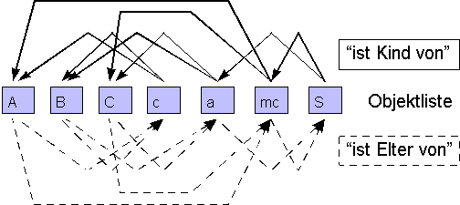 Das "Netz der Verwandtschaften" erscheint also in der Objektliste in Form von Verweisen auf Eltern- und Kind-Objekte, wobei jede Abhängigkeit durch 2 Verweise dargestellt wird: