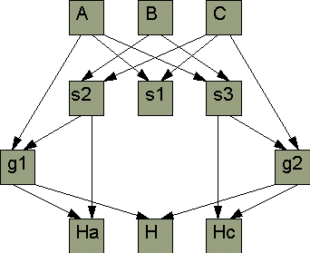 Neben den Start- und den Zielobjekten enthält ein Makro also auch noch sogenannte "Zwischenobjekte"; im obigen Beipiel sind dies s2, s3, g1 und g2. Für das Makro überflüssige Konstruktionsteile werden automatisch übersprungen, wie z.B. die Lotfußpunkte Ha und Hc. Von jedem Zielobjekt aus wird das Netz der Verwandtschaften rekursiv zurückverfolgt, bis jeder dieser Pfade in einem Startobjekt endet. Dabei kommt man nur an solchen Objekten vorbei, die "echte Ahnen" der Zielobjekte sind.