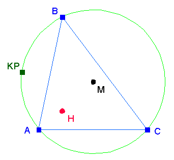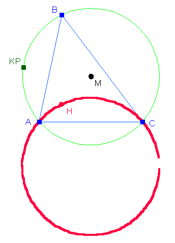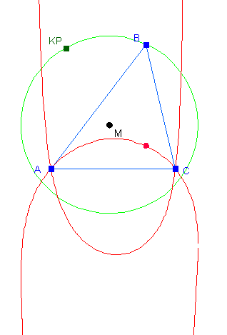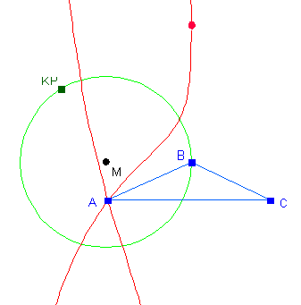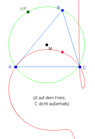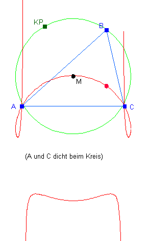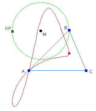 Was muß nun passieren, wenn man z.B. den Punkt KP ein Stück nach links zieht? Dabei wird der Kreis etwas größer, die Punkte A, B und C rutschen radial nach außen, die Dreiecksseiten werden nachgeführt, H wird neu berechnet, und schließlich bekommt die Ortslinie den Auftrag, sich zu aktualisieren, nämlich dann, wenn ihre drei Eltern (Zugpunkt, Generatorpunkt und Führungslinie) sich aktualisiert haben. Nun muß die Punkteliste mit neuen Daten gefüllt werden. Dazu muß der ganze Prozess der Ortslinienaufzeichnung intern nochmals durchgerechnet werden - mit der neuen Lage der Führungskurve! Also wird B intern auf dem nun vergrößerten Kreis entlanggeführt, wobei zu jeder Lage von B die zugehörige Lage von H ausgerechnet und in die Punkteliste der Ortslinie eingetragen wird.